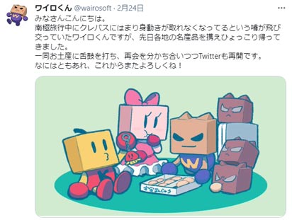 フフフ、皆さまお久しぶりです。 ワイロ星へ帰省していたのですがうっかり長旅になってしまいました。 実は私もTwitterをやっているので、フォローよろしくお願いいたします。私たちのちょっとした日常が覗けるかもしれませんよ。 | |