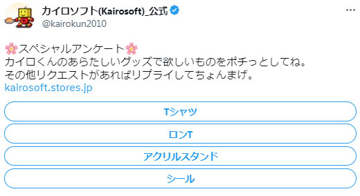 ただいまトゥィッターでグッズのアンケートをしているよ。アンケート期間は今日までなのでポチっと押してみてね![]() 他にもこんなグッズが欲しい!というリクエストがあればカイロくんのTwitterにリプライしてちょんまげ。 |