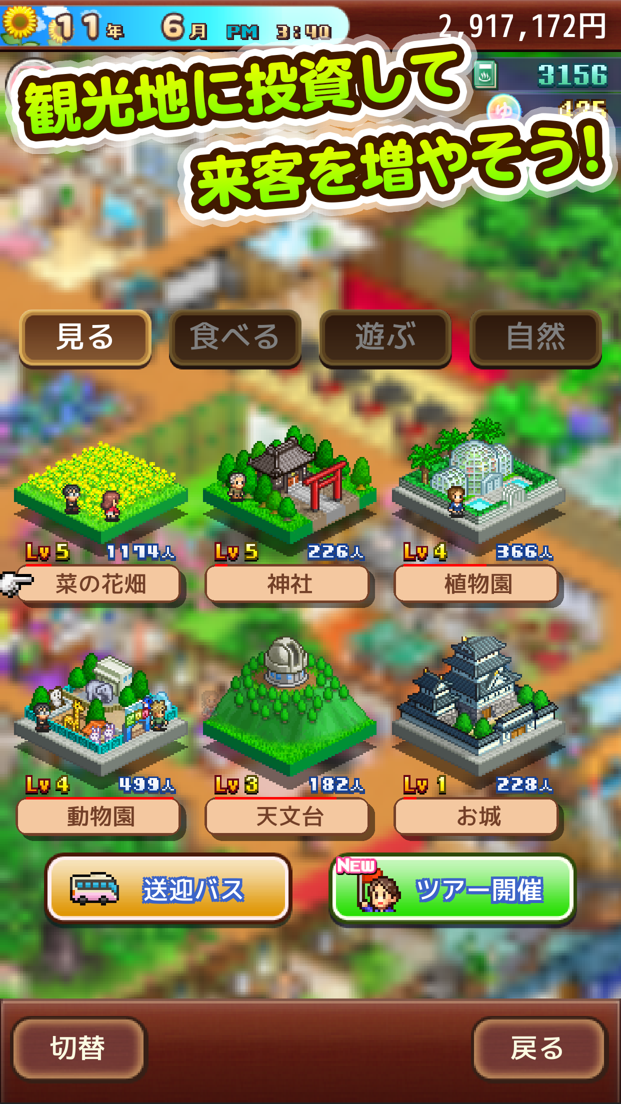 クエストや投資を実行することで、新しいお客さんや施設を獲得できます。